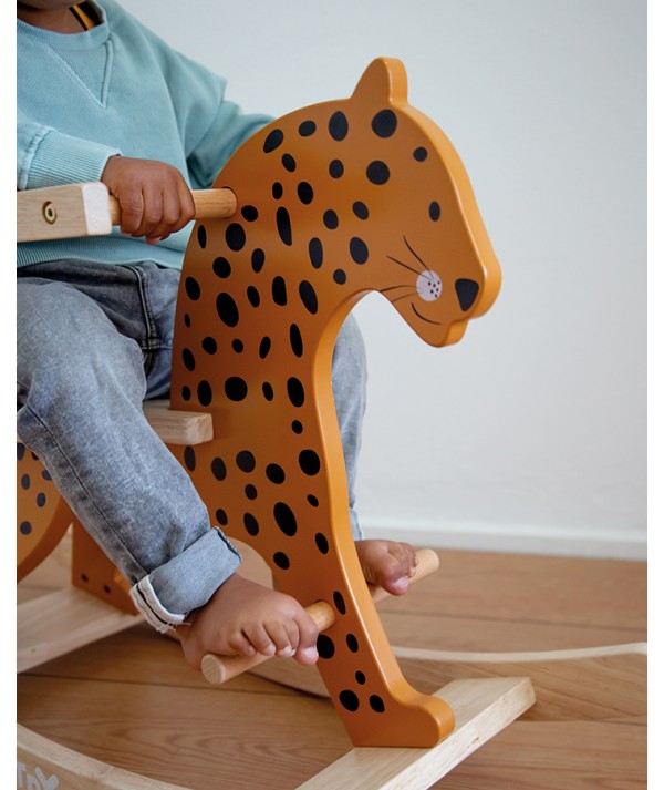 This rocking horse in the shape of a leopard will be a real eye-catcher in the baby or playroom! This rocking animal is made of sturdy, solid wood and has a closed seat so that the child is safe. The leopard can rock back and forth for lots of fun. Thanks to the black stoppers on the base, it is tilt-safe.