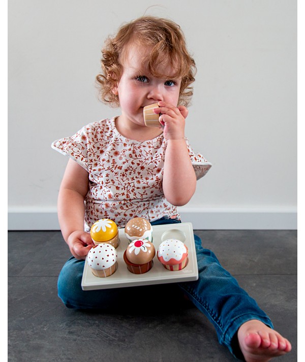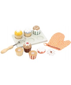 Baking is a lot more fun with this wooden cupcake set. The set contains 6 cupcakes, each with a different topping that can be separated from each other. Thanks to the oven glove, beater and oven dish, it becomes even more real!