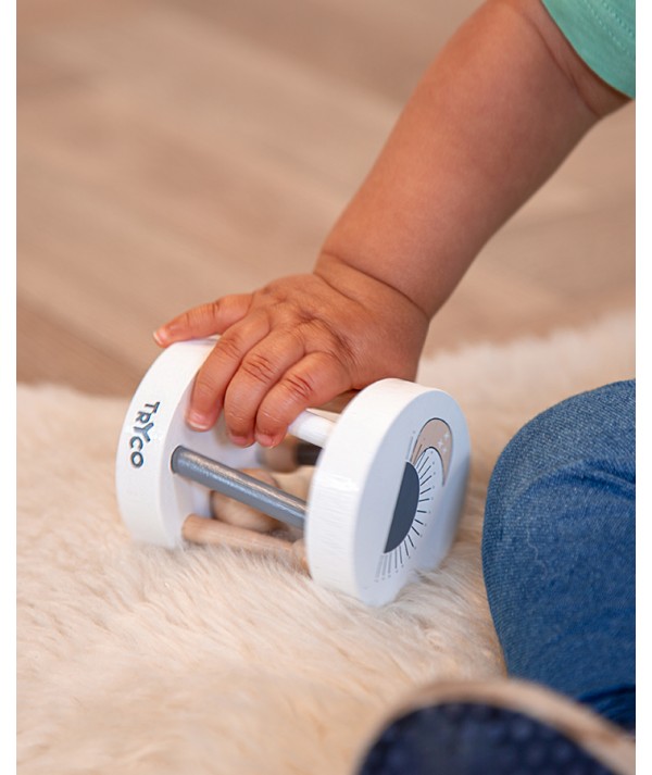 Ta drewniana grzechotka może się toczyć, co powoduje, że znajdujące się w walcu kulki grzechoczą. To z pewnością zachęci dziecko do sięgnięcia po nią i dalszą zabawę.